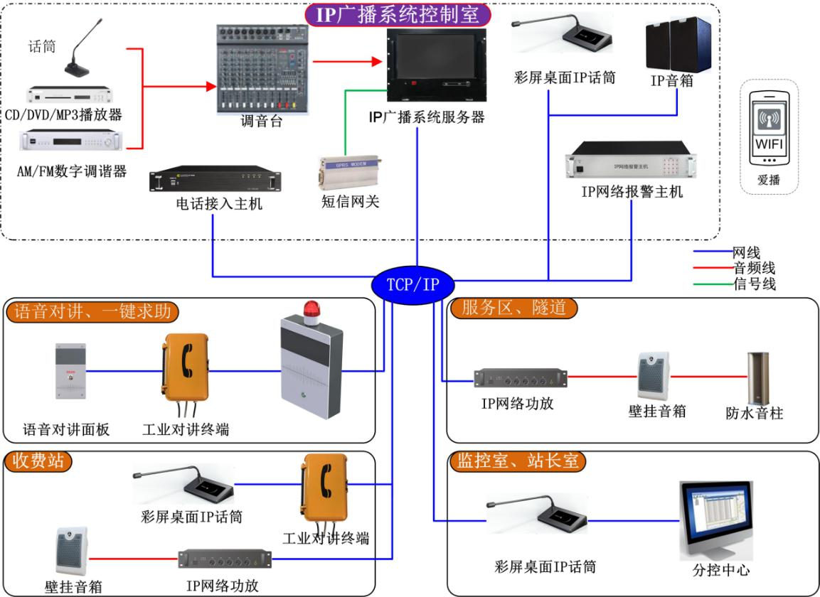 系統由路段管理中心、收費站點,服務區,求助點,應急廣播構成。系統采用TCP/IP網絡架構,通過網絡承載。系統通過專業的服務器對廣播終端設備進行統一管理,對轄區內各場所實現智能網絡廣播的基本功能。